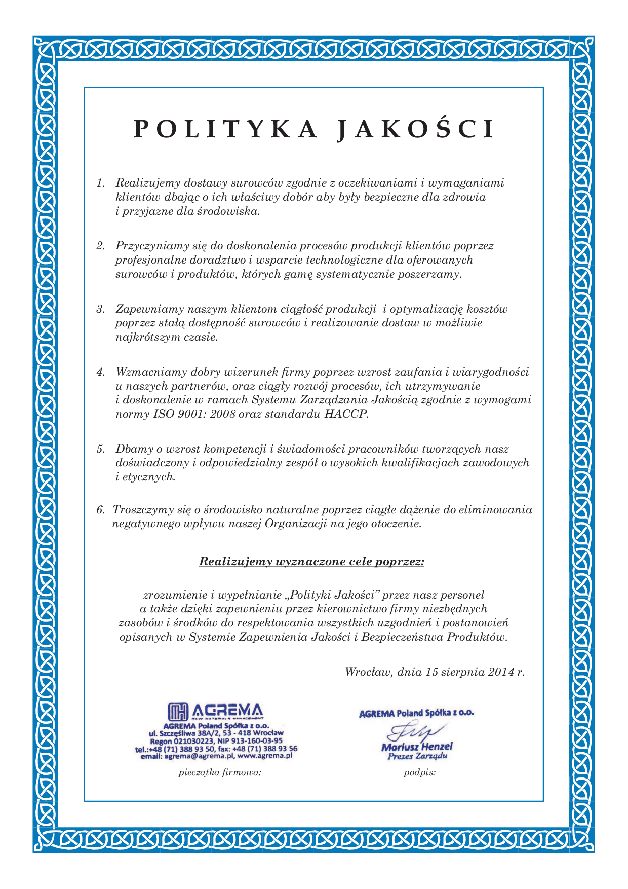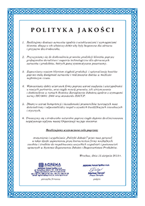 Strategia działania naszej firmy, nasze cele i zadania, które stanowią stały element naszego Systemu Jakości i wspierają nasz rozwój, zawarte zostały w przedstawionej poniżej "Polityce Jakości".